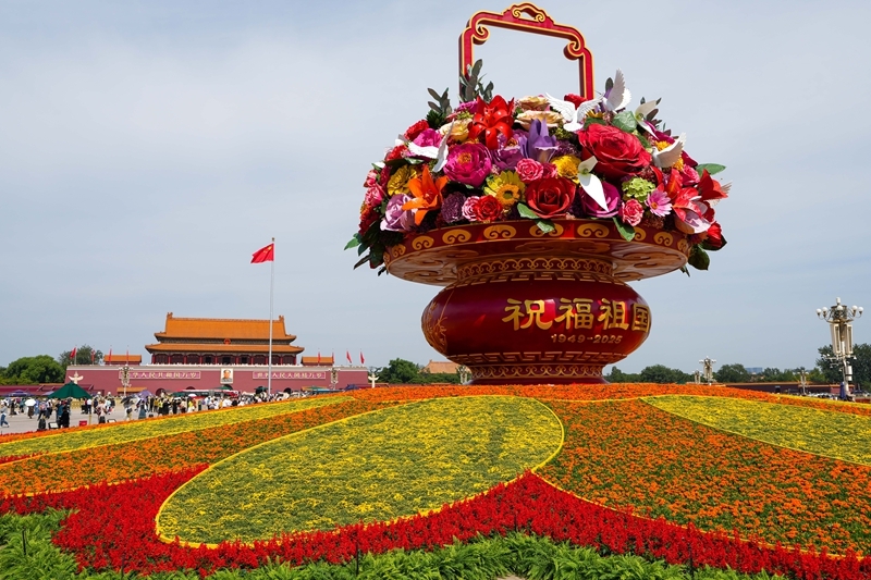 9月25日,2025年“祝福祖国”巨型花篮正式完工,亮相天安门广场与市民共度佳节。今年“祝福祖国”花坛以喜庆的花篮为主景,花坛顶高18米,篮体高16米,篮盘直径12米。篮体南侧书写“祝福祖国”“1949-2025”字样,篮体北侧书写“欢度国庆”“1949-2025”字样。篮内选取了美好寓意的花卉,其中荷花寓意“和和美美”、橄榄枝寓意“荣耀和平”等,还结合和平鸽元素,体现“和平发展、欣欣向荣”。