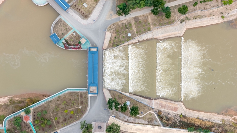 10月16日,用于灌溉的黄河水流经内蒙古巴彦淖尔市临河区境内的总干渠第二分水枢纽(无人机照片)。