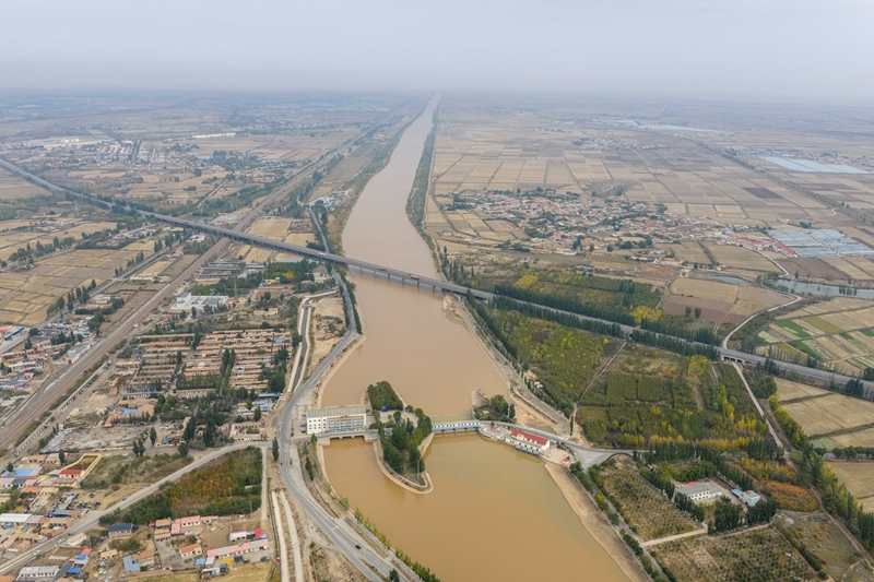 10月16日,用于灌溉的黄河水流经内蒙古巴彦淖尔市磴口县境内的黄河总干渠(无人机照片)。