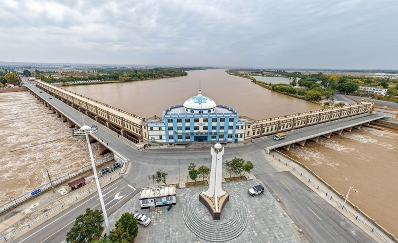 这是10月16日在内蒙古巴彦淖尔市磴口县拍摄的开闸放水的三盛公水利枢纽(无人机照片)。