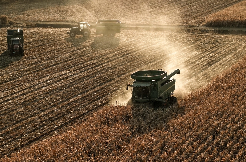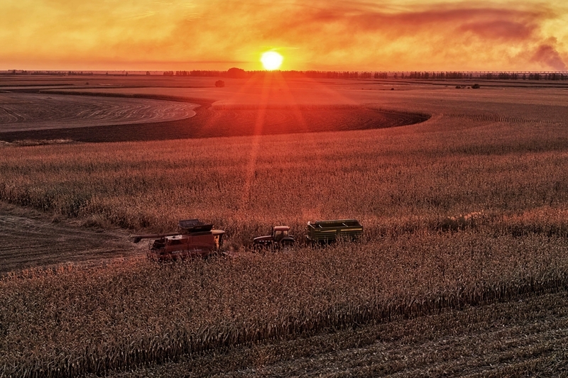 10月16日,在北大荒集团黑龙江八五六农场有限公司第四管理区,种植户在抢收玉米(无人机照片)。