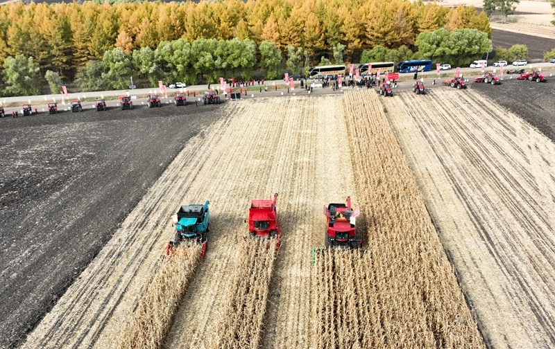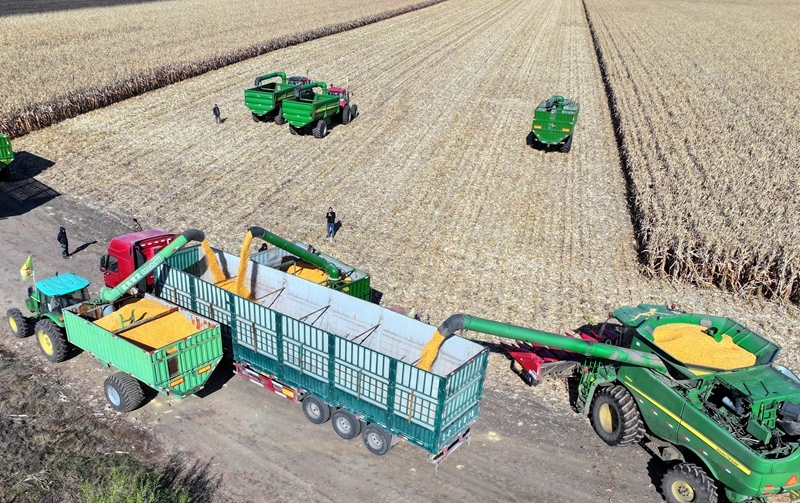 10月13日,在北大荒集团黑龙江格球山农场有限公司玉米地块,大型农机在进行抢收作业(无人机照片)。