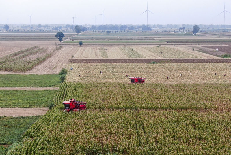 10月14日,在河南省商丘市睢县董店街道曹庄村一处农田内,收割机在抢收玉米(无人机照片)。