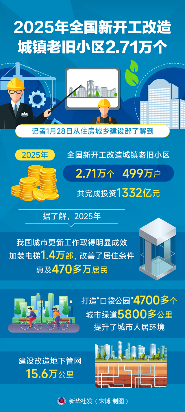 记者1月28日从住房城乡建设部了解到,2025年,全国新开工改造城镇老旧小区2.71万个、499万户,共完成投资1332亿元。