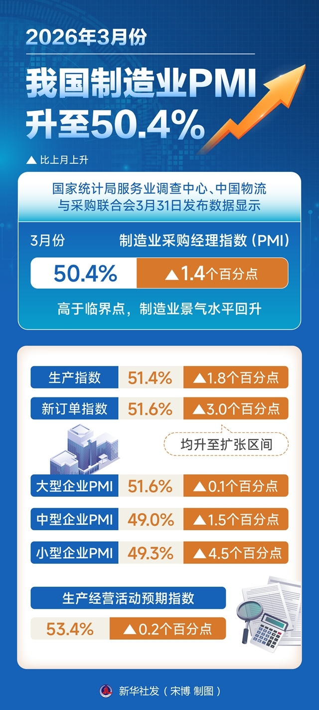图表:2026年3月份我国制造业PMI升至50.4%
